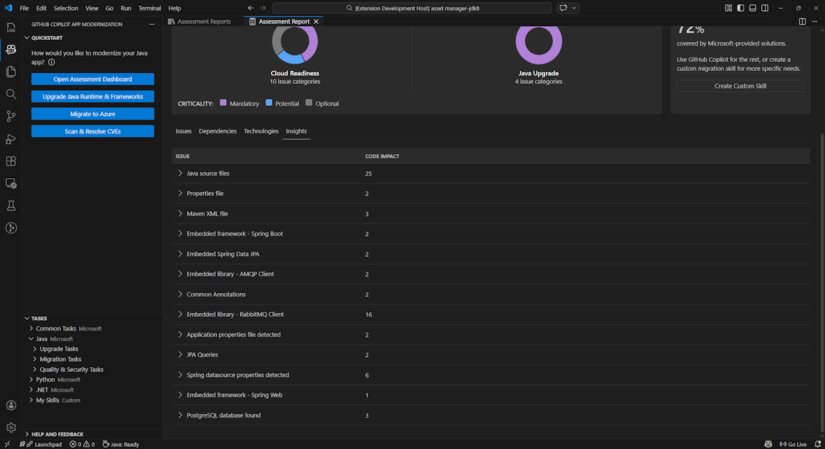 - Seleccione Start Assessment (Iniciar evaluación ) o Open Assessment Dashboard (Abrir panel de evaluación) en la sección QUICKSTART del panel de modernización de GitHub Copilot.