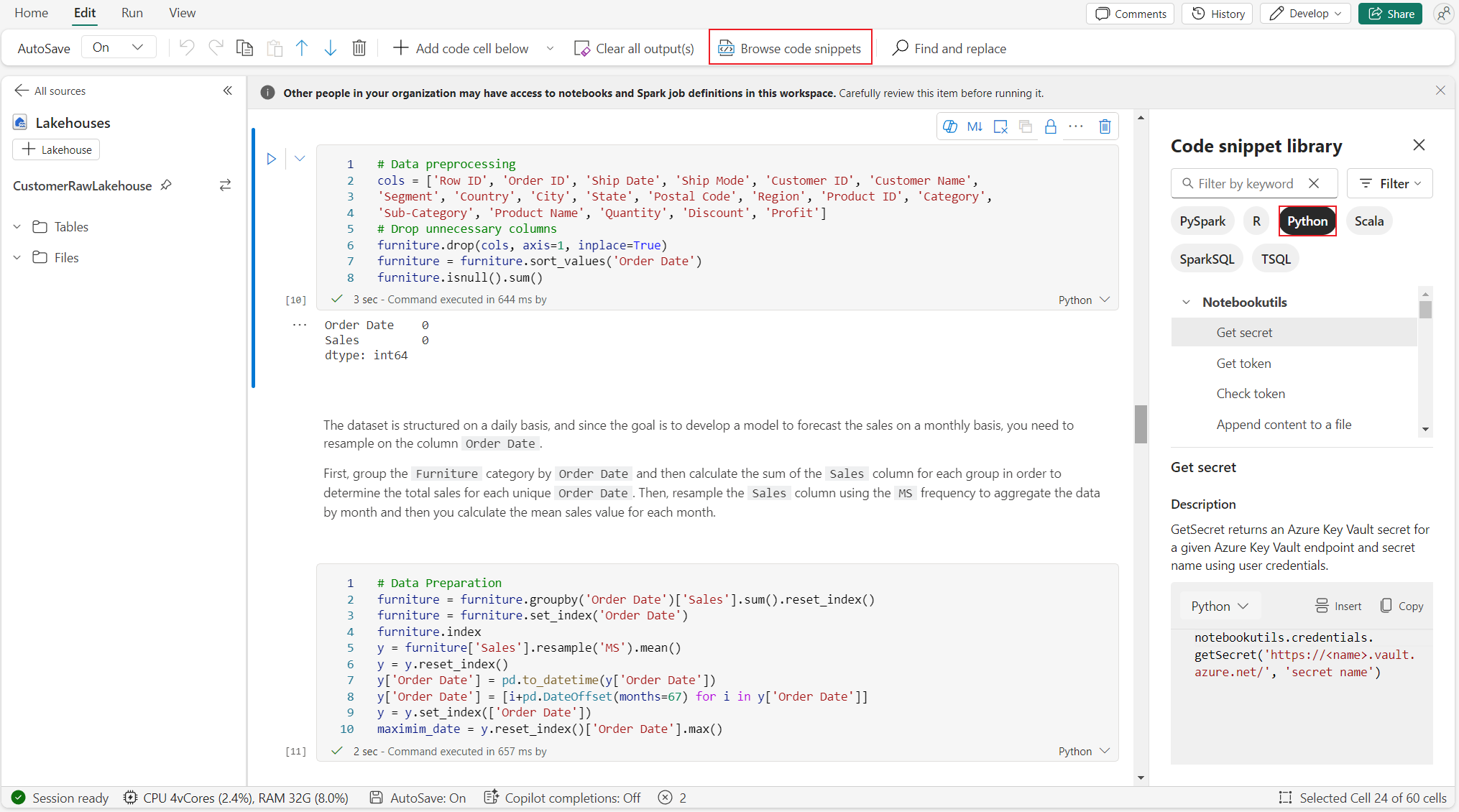 Almacenes de lago de datos y Recursos están disponibles de forma nativa: el almacén de lago de datos de Fabric y la funcionalidad completa de los recursos integrados en el Cuaderno están disponibles en el cuaderno de Python. Esta característica permite a los usuarios traer fácilmente los datos al cuaderno de Python, simplemente intente arrastrar y soltar para obtener el fragmento de código.