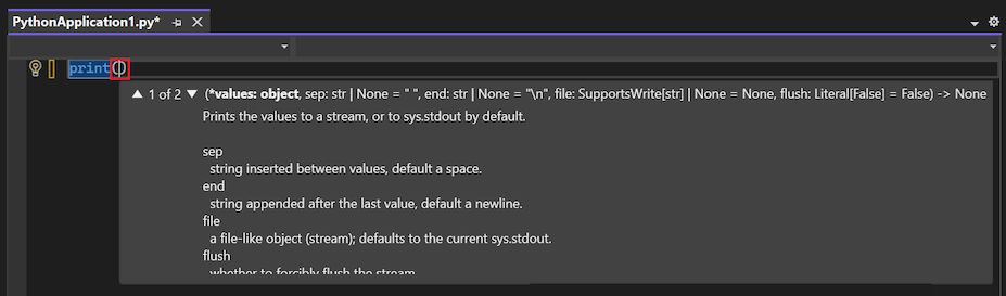 print.Al escribir el nombre de la función, Visual Studio IntelliSense muestra las opciones de autocompletar del código. La opción de finalización predeterminada está resaltada: