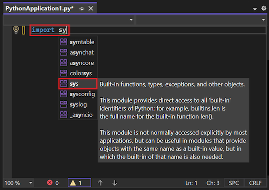 import sys. Al empezar a escribirsys, Visual Studio muestra una lista de posibles módulos para la funciónimport:Puede desplazarse por la lista para ver el conjunto completo de módulos disponibles.