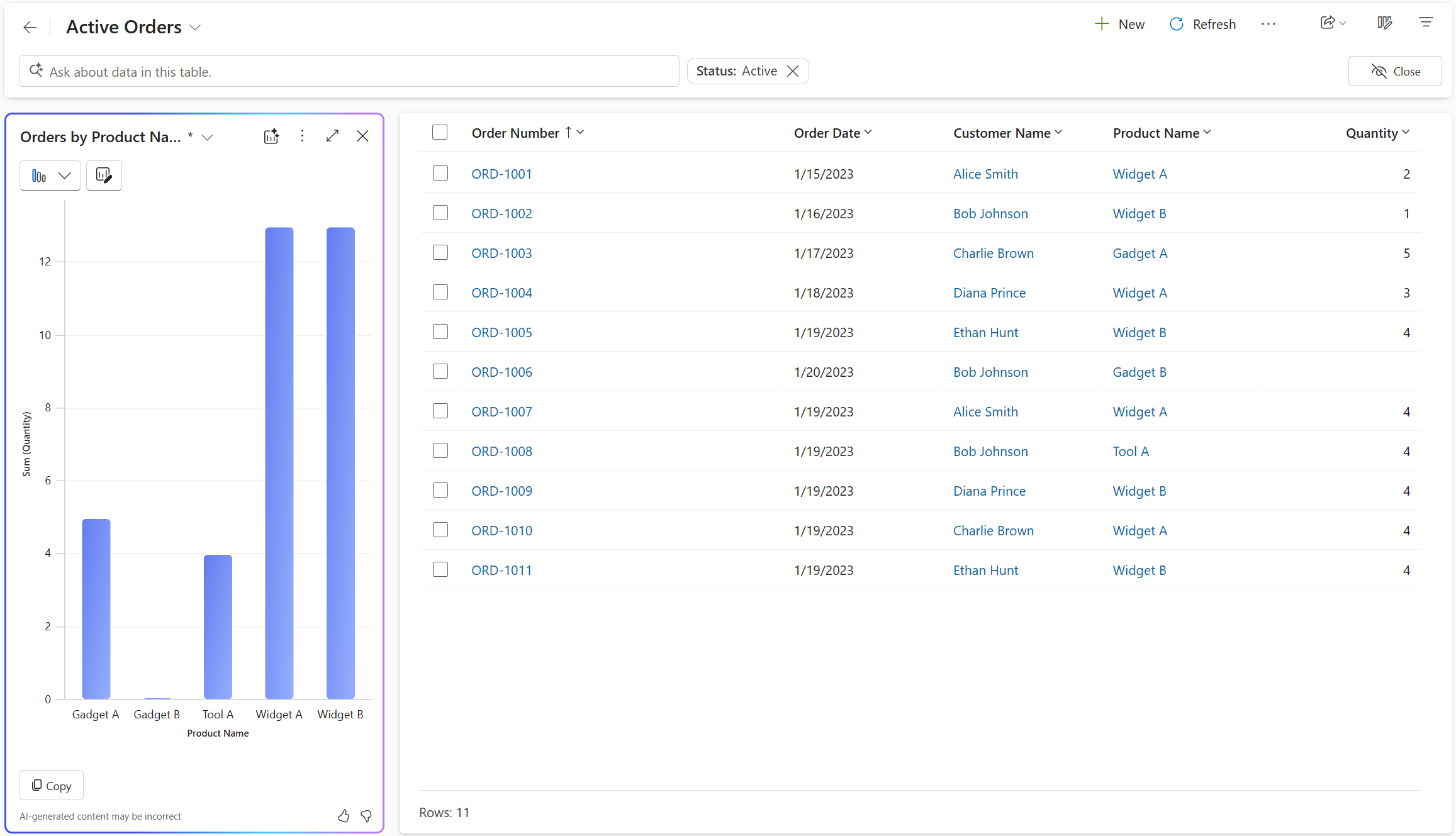 Lorsque vous sélectionnez Visualiser, le volet du graphique s’ouvre en regard de la grille et complète la table de lignes. Si le tableau possède des graphiques système ou personnels, le graphique par défaut du tableau s’affiche. Si le tableau n’a pas de graphiques, l’IA génère une visualisation pour l’affichage en fonction des colonnes et filtres visibles. La visualisation est un graphique qui agrège les données de la vue.