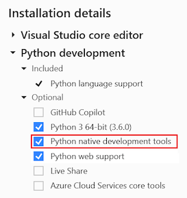 Lorsque vous installez la charge de travail des applications de science des données et d’applications analytiques , Python et l’option outils de développement natifs Python sont installées par défaut.