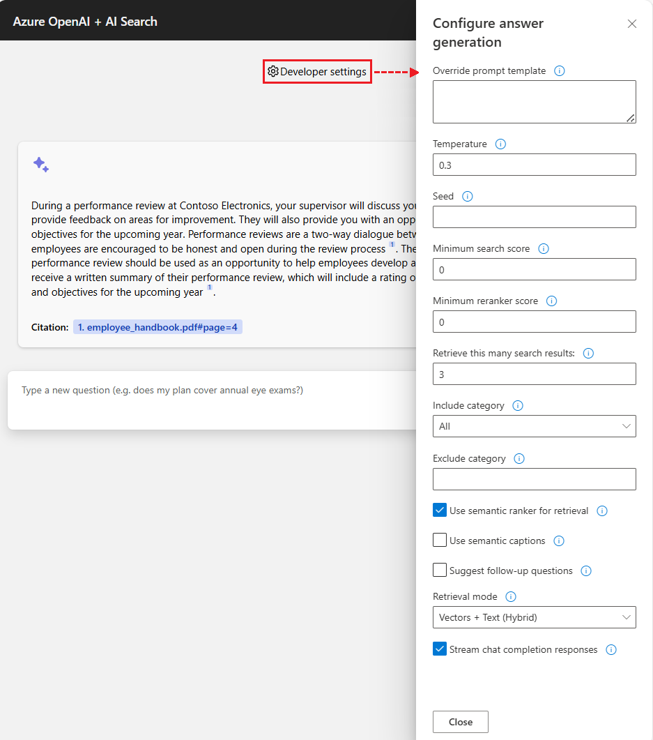 Il modello OpenAI specifico determina l'intelligenza della chat e le impostazioni usate per interagire con il modello. L'opzione Impostazioni sviluppatore apre il riquadro Configura generazione risposte in cui è possibile modificare le impostazioni per l'app di chat: