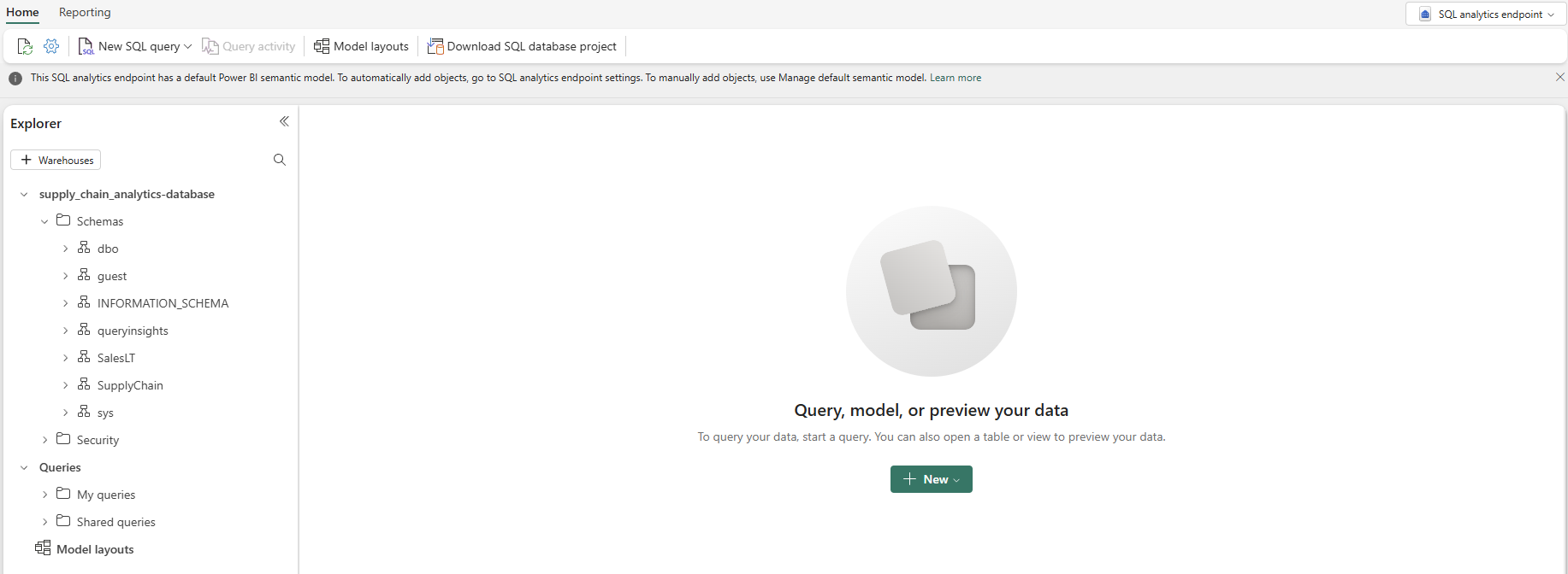 È possibile eseguire query su uno qualsiasi dei dati con mirroring nell'endpoint di analisi SQL usando istruzioni Transact-SQL standard compatibili con un'istanza di Fabric Warehouse. Non è possibile aggiungere oggetti contenenti dati a questi dati, ma è possibile aggiungere visualizzazioni ai dati per scopi di creazione di report e analisi. L'uso dell'endpoint di analisi SQL di sola lettura riduce la pressione di calcolo dal database operativo e ridimensiona il sistema per scopi di creazione di report e analisi.