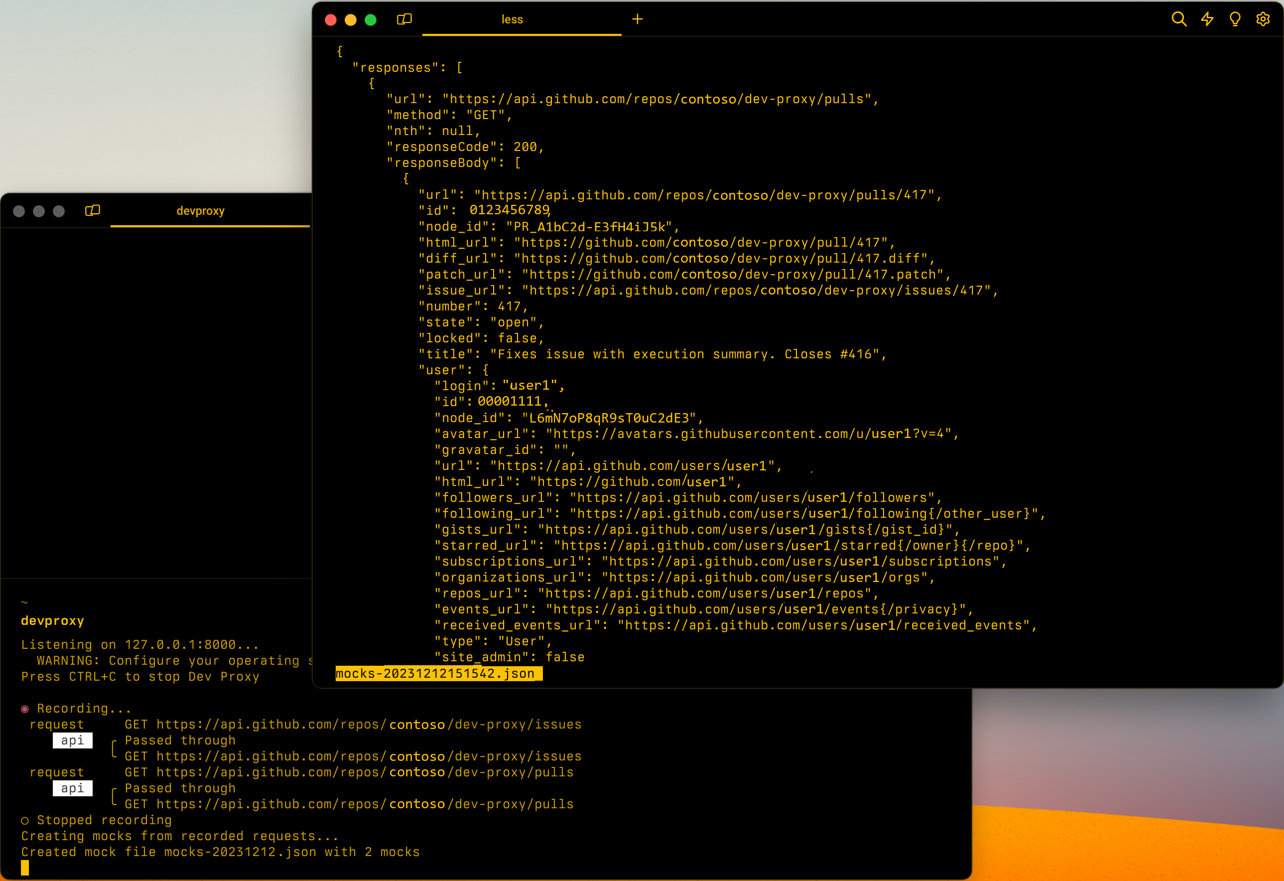 Per intercettare le richieste, dopo aver avviato Dev Proxy, avviare registrazione. Al termine, interrompere la registrazione. Il proxy di sviluppo genererà simulazioni per le richieste intercettate e le scriverà in un file denominato mocks-yyyyMMddHHmmss.json nella cartella di lavoro corrente.