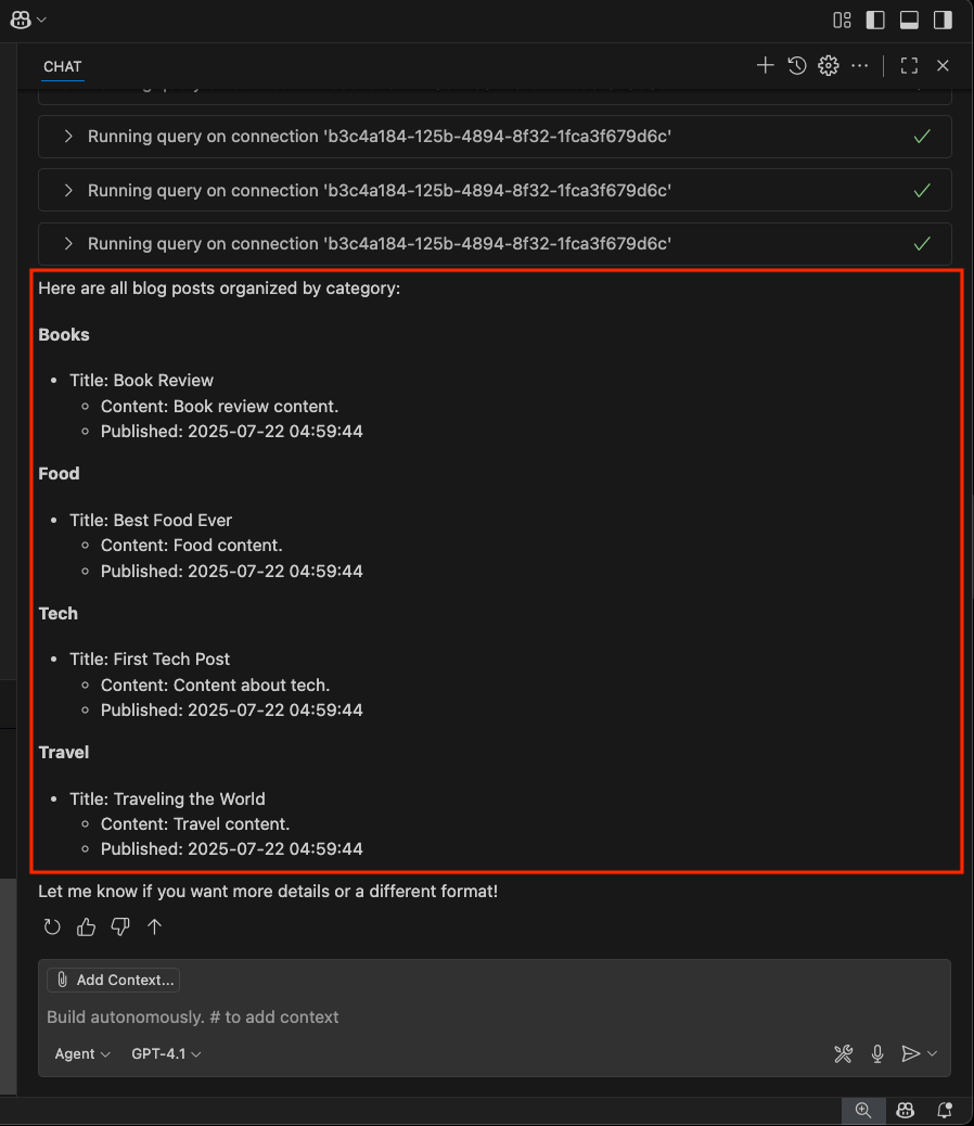 È anche possibile usare variabili di chat come #mssql_connect richiamare direttamente questi strumenti o scrivere richieste in linguaggio naturale, ad esempio: