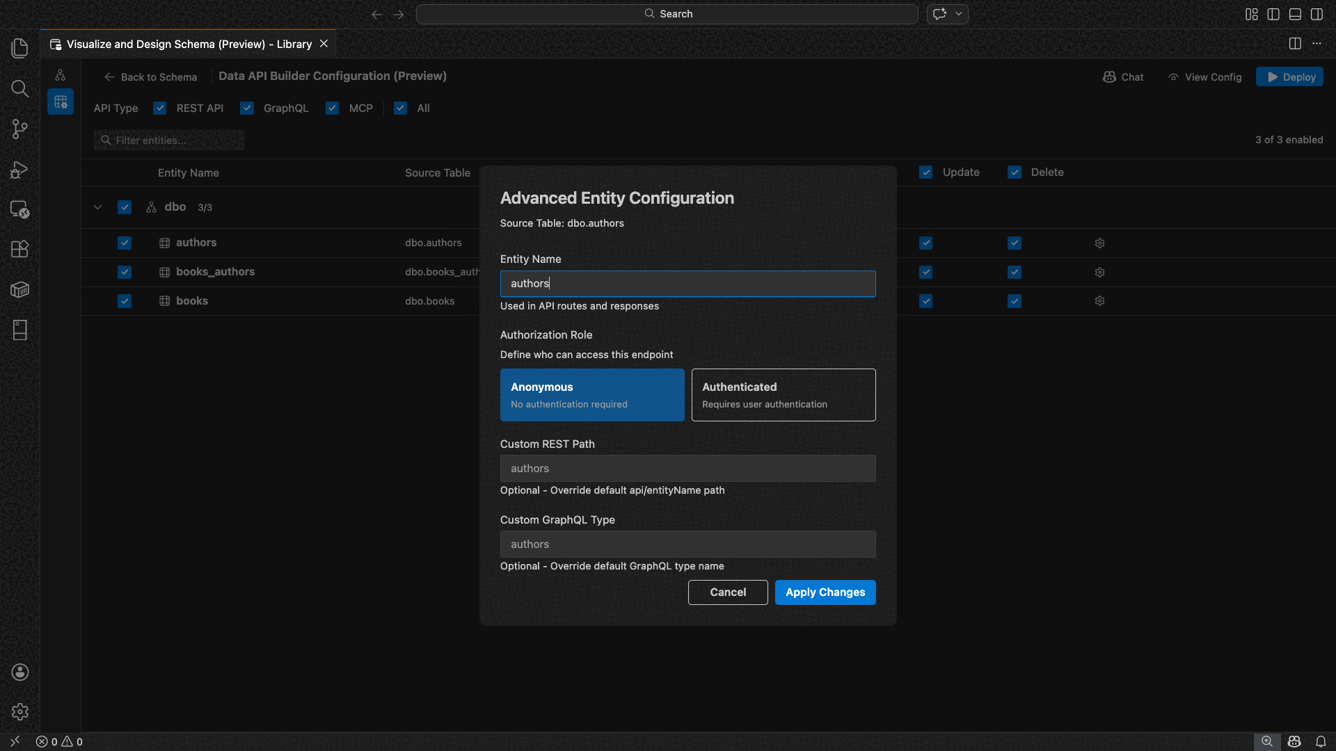 "Enable all SalesLT entities for read operations""Expose only the Customer and Product tables with full CRUD permissions""Set all entities in the dbo schema to read-only""Disable the BuildVersion and ErrorLog entities""Can you also enable MCP for the Data API builder API?"