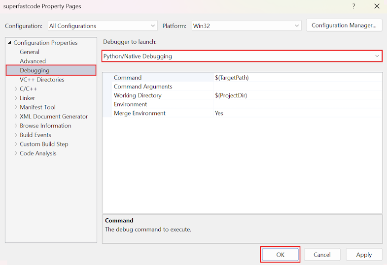 Quando si abilita il debug del codice nativo, la finestra di output di Python potrebbe chiudersi immediatamente dopo che il programma è terminato, senza fermarsi per visualizzare il prompt Press any key to continue. Per forzare la pausa e la richiesta dopo aver abilitato il debug del codice nativo, aggiungere l'argomento