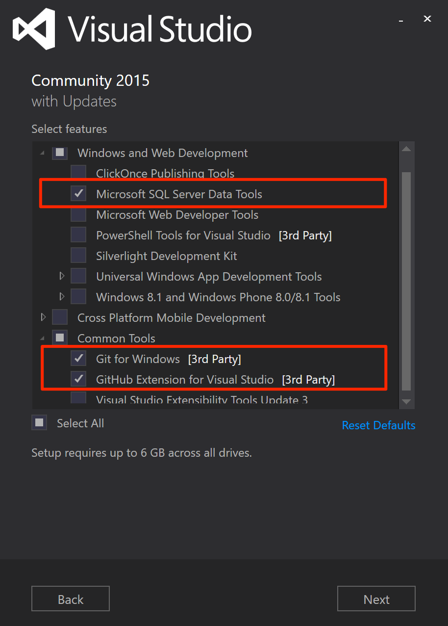 機能選択の一覧から、[Microsoft SQL Server Data Tools]、[Git for Windows]、[GitHub Extension for Visual Studio] を選択します。