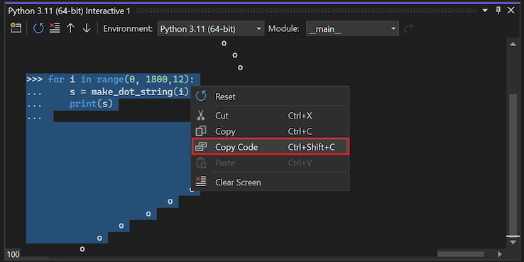 for i in range(0, 1800, 12): s = make_dot_string(i) print(s)プロンプトやプログラム出力など、 対話型ウィンドウの正確な内容をコピーするには、標準の コピー コマンドを使用します。