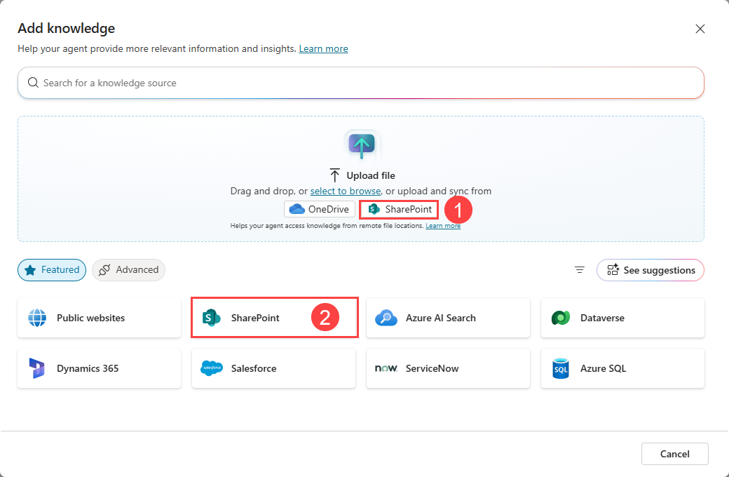 Det SharePoint alternativet i filopplastingsdelen (1) er for å laste opp individuelle SharePoint filer eller mapper til agenten din. Dette alternativet laster opp en kopi av filen fra SharePoint til Dataverse og opprettholder en synkron relasjon for å holde filen oppdatert. Under spørringer får SharePoint tilgang til å validere brukertillatelser for innholdet. Dataverse lagrede filer bruker datalagring, men gir en fullstendig semantisk søkefunksjonalitet og støtte for tekst i bilder for bestemte dokumenttyper som PDF-filer.