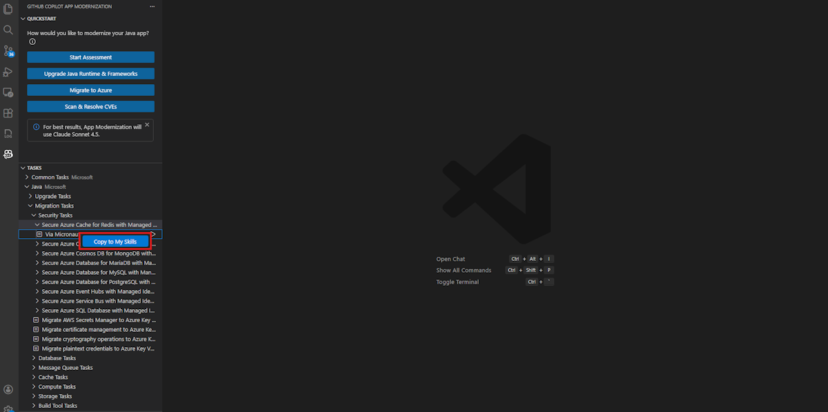 In de zijbalk Activiteit open het deelvenster GitHub Copilot modernisering, beweeg de muisaanwijzer over de sectie TASKS en selecteer vervolgens Maak een aangepaste vaardigheid.