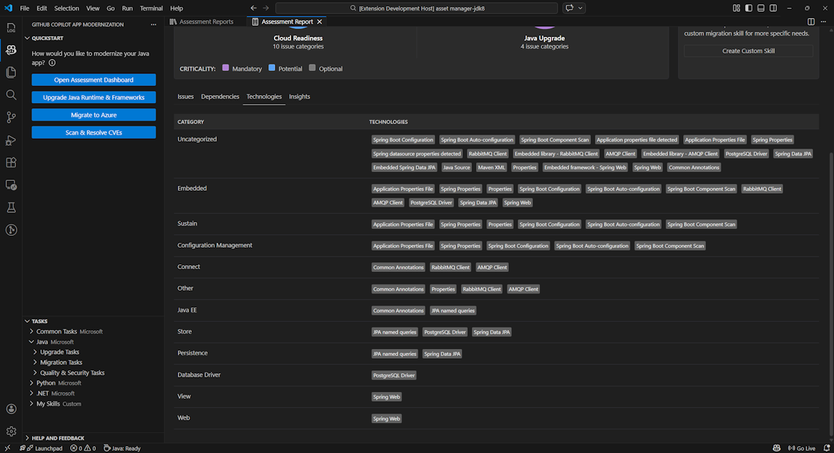- Toepassingsgegevens: basisinformatie over uw toepassing, waaronder Java-versie, frameworks, buildhulpprogramma's, projectstructuur en doelservice van Azure.