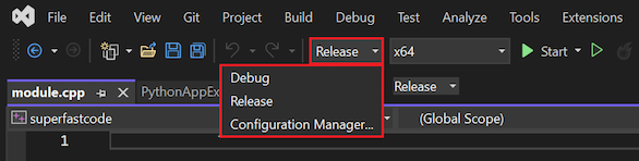 - Voor het C++-project (superfastcode of superfastcode2) wijzigt u de doelconfiguratie zodat deze overeenkomt met uw Python-installatie. Als de C++-projectdoelconfiguratie bijvoorbeeld Win32 is, maar uw Python-installatie 64-bits is, wijzigt u de C++-projectdoelconfiguratie in x64.