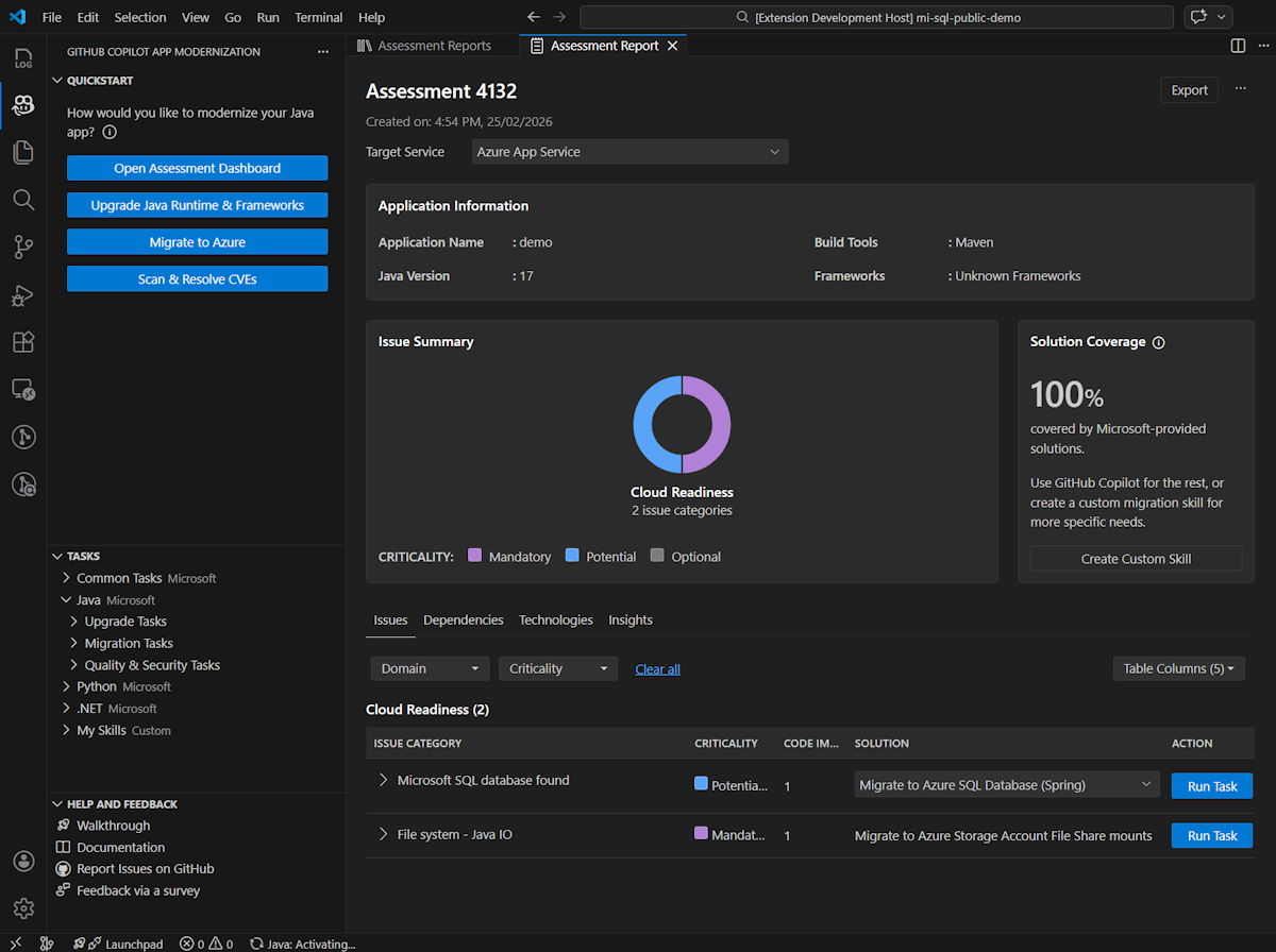 mi-sql-public-demoprojeto no repositório de exemplos.Na barra lateral, selecione o painel de modernização do GitHub Copilot , no qual você pode selecionar Iniciar Avaliação ou Executar Avaliação na seção AVALIAÇÃO .