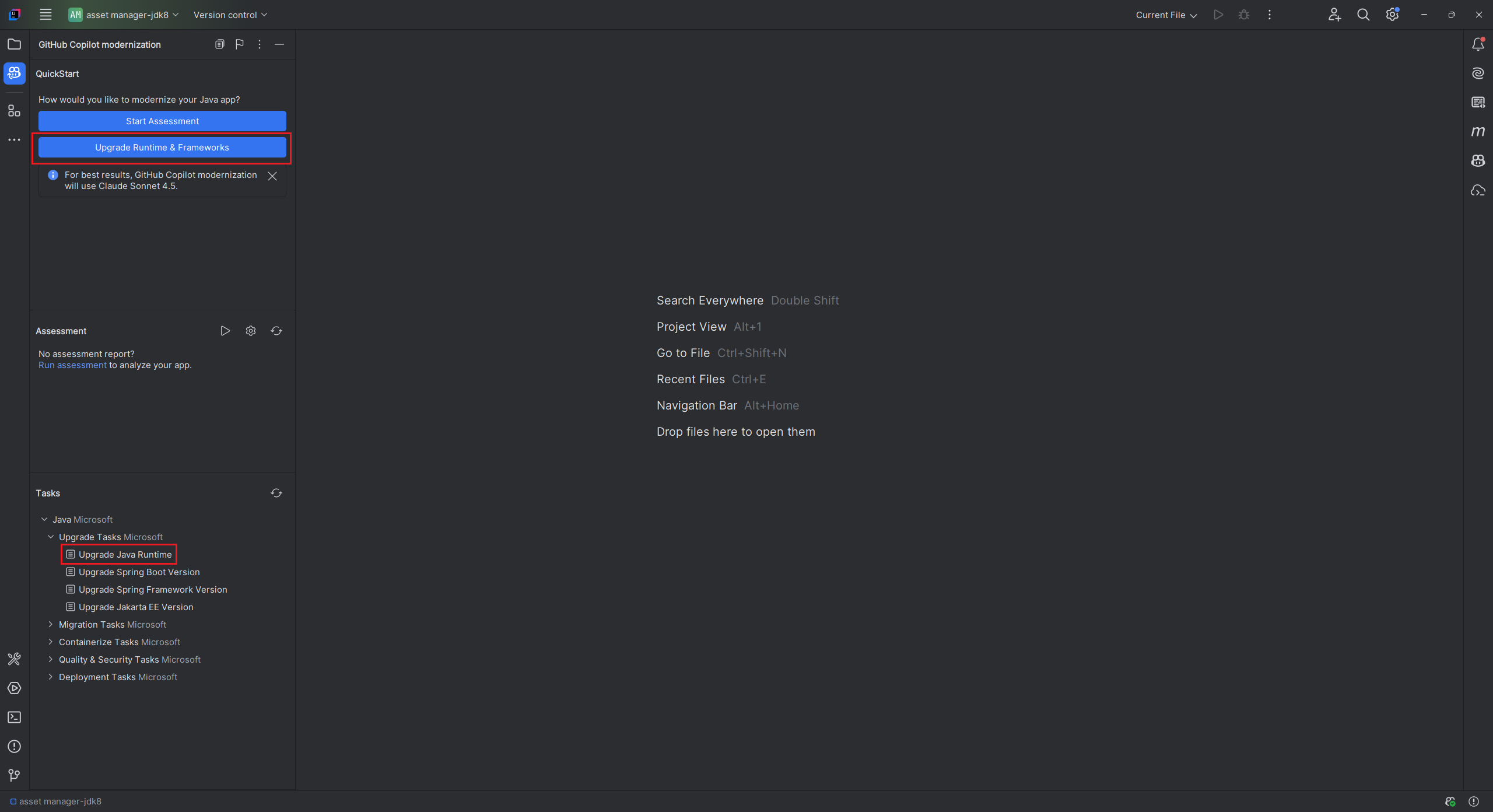 Uma maneira de atualizar sua versão do JDK é selecionar Atualizar Runtime &Frameworks na seção INÍCIO RÁPIDO . Outra maneira é executar a tarefa Runtime do Java Atualizado na seção TAREFAS – Tarefas de Upgrade. Para obter mais informações, consulte Início Rápido: atualizar um projeto Java com a modernização do GitHub Copilot.