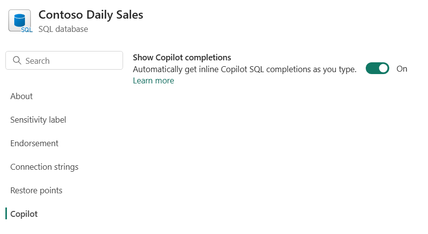 Verifique a configuração Mostrar conclusões do Copilot está habilitada nas configurações do banco de dados.