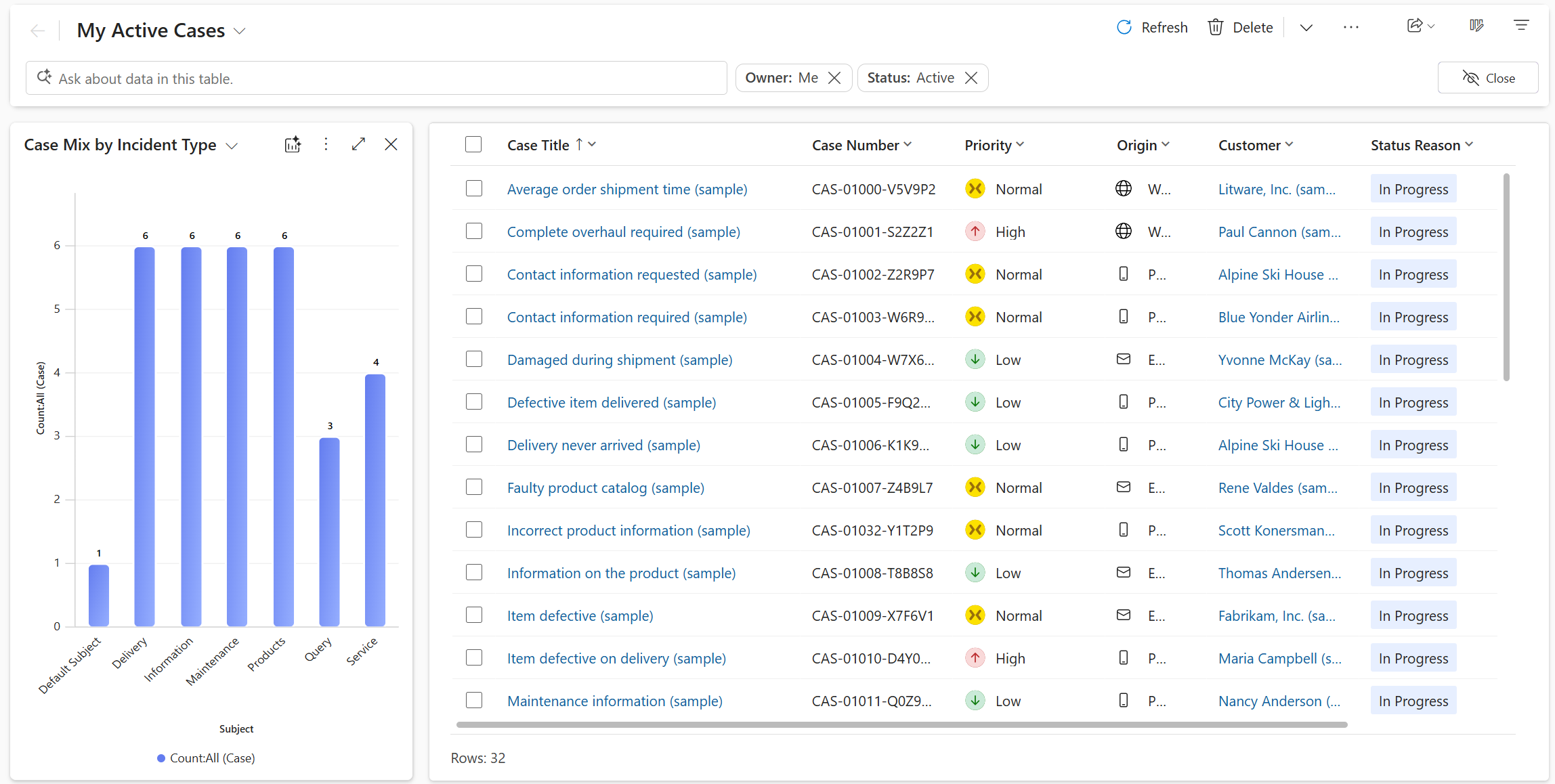 Quando você seleciona Visualizar, o painel do gráfico é aberto ao lado da grade, complementando a tabela de linhas. Se a tabela tiver gráficos pessoais ou de sistema, o gráfico padrão da tabela será exibido. Se a tabela não tiver gráficos, a IA gerará uma visualização para a exibição com base nas colunas e filtros visíveis. A visualização é um gráfico que agrega os dados na exibição.