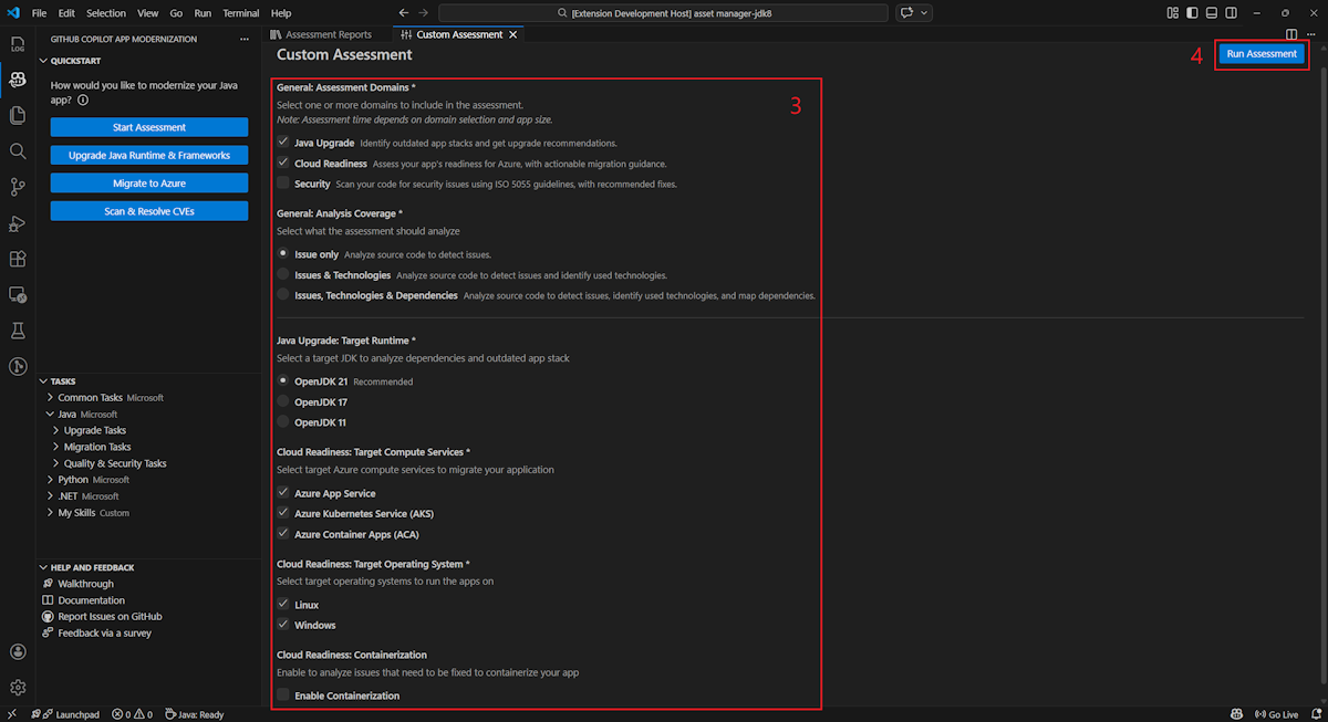 target: o serviço de computação Azure para executar as aplicações. Escolhe vários alvos se ainda não decidires qual usar. Depois, pode comparar os objetivos no relatório de avaliação.Valor Description azure-aksPráticas recomendadas para implantar um aplicativo no Serviço Kubernetes do Azure. azure-appservicePráticas recomendadas para implantar um aplicativo no Serviço de Aplicativo do Azure. azure-container-appsPráticas recomendadas para implantar um aplicativo em Aplicativos de Contêiner do Azure. capability: a tecnologia alvo para modernizar as aplicações.Valor Description containerizationPráticas recomendadas para aplicativos de conteinerização. openjdk11Práticas recomendadas para migrar para o OpenJDK 11. openjdk17Práticas recomendadas para migrar para o OpenJDK 17. openjdk21Práticas recomendadas para migrar para o OpenJDK 21. os: o sistema operativo alvo para executar as aplicações.Valor Description linuxPráticas recomendadas para migrar aplicativos para a plataforma Linux. windowsPráticas recomendadas para migrar aplicativos para a plataforma Windows. mode: o modo de análise.Valor Description issue-onlyAnalisa o código-fonte para detetar apenas problemas. source-onlyAnalisar o código-fonte para detetar tanto problemas como tecnologias usadas. fullAnalisar o código-fonte para detetar tanto problemas como tecnologias usadas, e listar dependências.