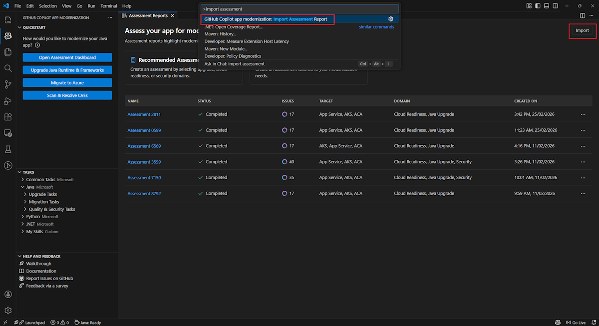Para importar um relatório de avaliação para a modernização do GitHub Copilot, selecione Importar na página de relatórios de avaliação, ou pressione Ctrl+Shift+P e depois procure por relatório de avaliação de importação.
