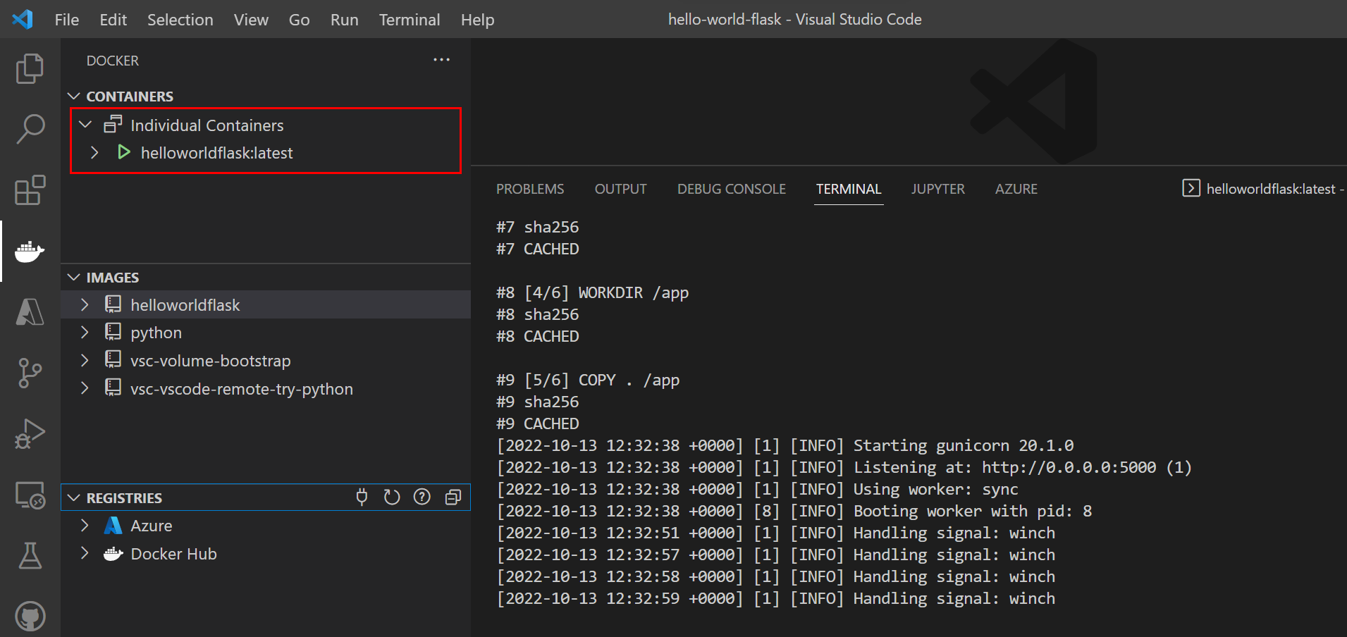 Você também pode trabalhar com imagens e contêineres do Python Docker usando a CLI do Azure e a CLI do Docker. Tanto o VS Code quanto o PyCharm têm terminais onde você pode executar essas CLIs.