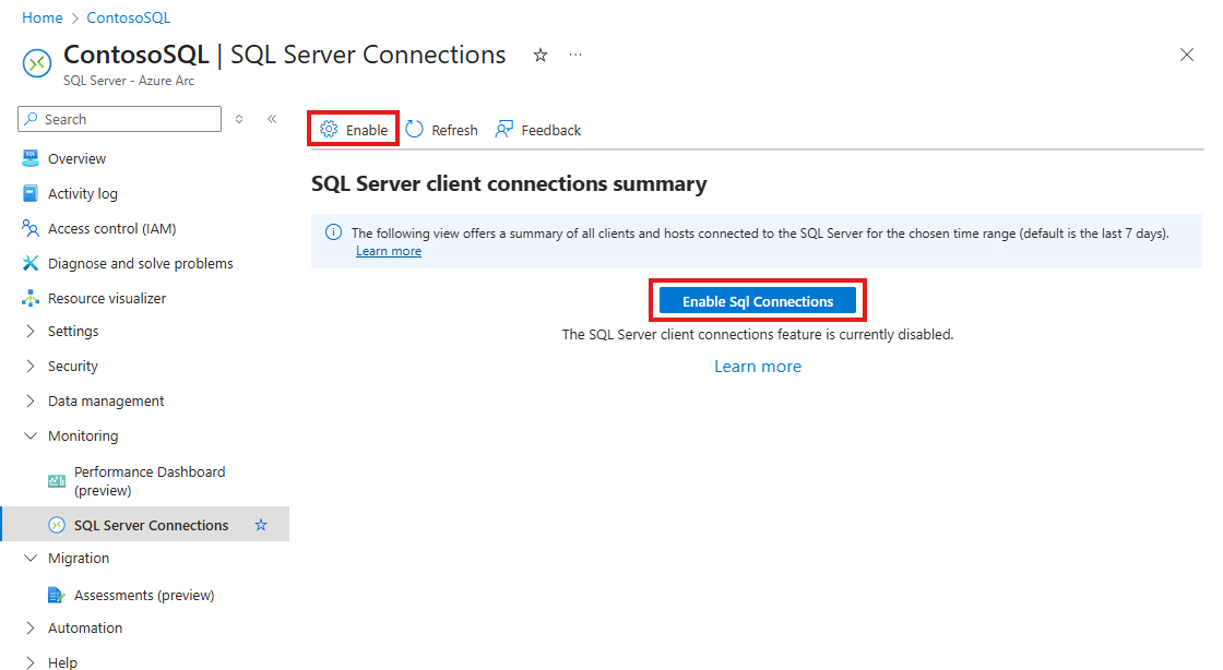 Se o modo de exibição Conexões do SQL Server e a coleta de dados estiverem desabilitados, você poderá habilitá-lo novamente usando o portal do Azure ou a CLI do Azure.