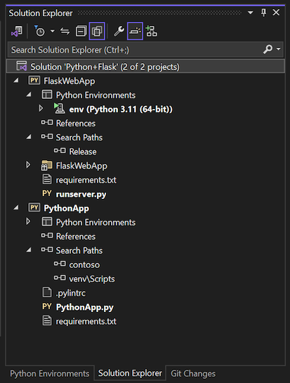 A imagem a seguir mostra um exemplo de uma solução do Visual Studio contendo projetos Python e Flask no Gerenciador de Soluções.