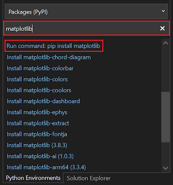 No campo Pesquisar , digite matplotlib. Na lista de resultados, selecione a opção Executar comando: pip install matplotlib.