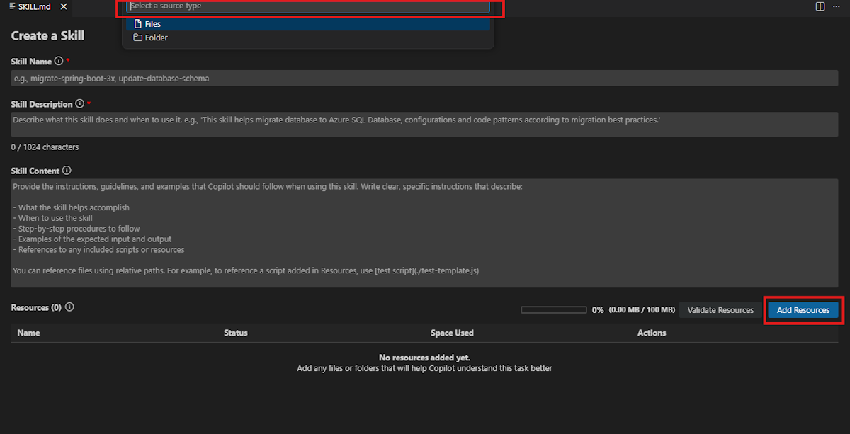 De markerade filerna kopieras till .github/skills/<skill-name>/ i projektet. Resursfiler och mappar lagras tillsammans SKILL.md i kunskapsmappen. Den totala resursstorleken är begränsad. Se till att referera till dessa filer eller mappar efter namn i fältet Skill Content så att Copilot vet när de ska användas.