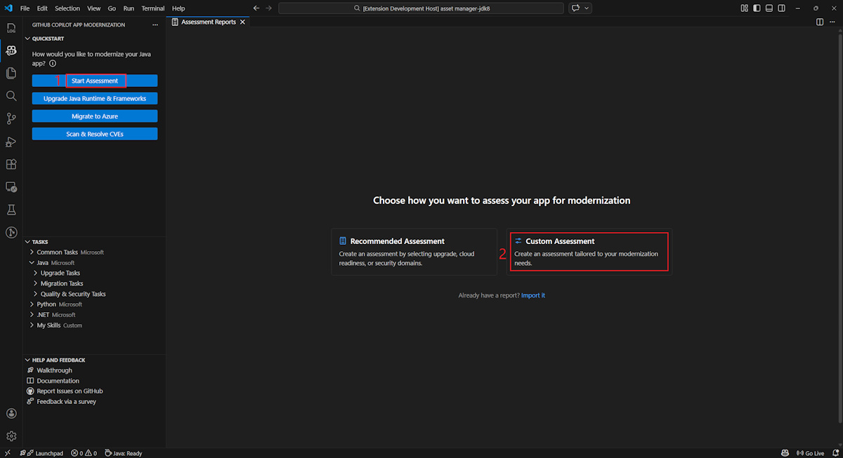 - Välj Starta utvärdering eller Öppna utvärderingsinstrumentpanelen i avsnittet SNABBSTART i gitHub Copilot-moderniseringsfönstret.
