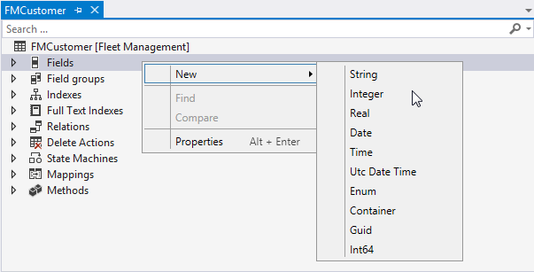 The value of a node in the element designer often references another element. For example, a field node in a table element is typically based on an extended data type (EDT) element. When you right-click a node in the element designer, you can select the Go to <element> command to navigate to that related element. For example, when you right-click the FuelType node in the list of fields for the FMVehicle table, you can select Go to Base Enum FMFuelType to show the base enumeration that is used to define the field.