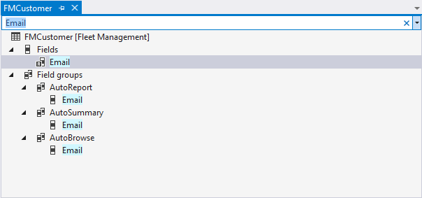 Sometimes, the node list for an element is long, so it's difficult to find the specific node that you're looking for. Each element designer has a search bar at the top. Enter a string to search for, and the node list filters to include only the nodes that match the search string. For example, the following illustration shows the element designer for the FMCustomer table after the "Email" search term is applied. Only nodes that have names that match that search term appear in the element designer.