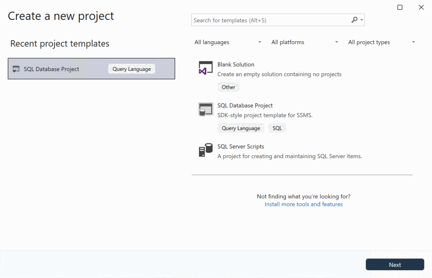 I dialogrutan Nytt projekt använder du termen SQL Server- i sökrutan. Det översta resultatet ska vara SQL Server Database Project, SDK-format (förhandsversion).