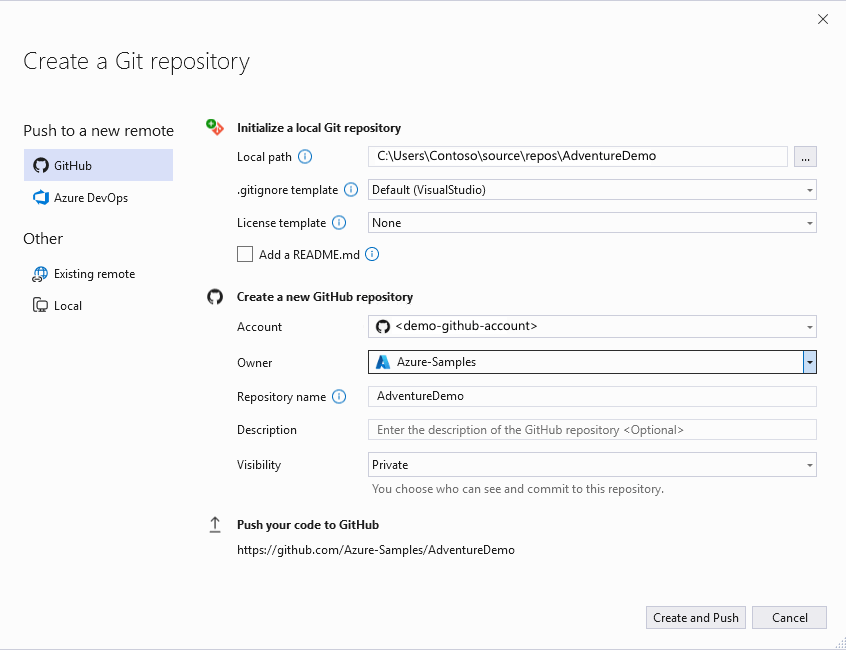 I dialogrutan Skapa en Git-lagringsplats, under avsnittet Push to a new remote, väljer du GitHub.